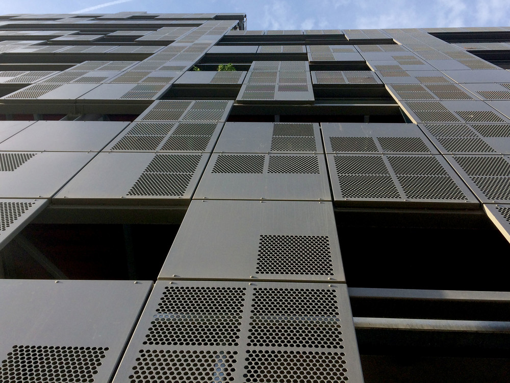Le quartier Confluence à Ivry-sur-Seine, ville accolée au sud-est de Paris, avait pour ambition de revitaliser l’ancien quartier industriel de la ville par la construction de logements et d’équipements publics. Ces 53 logements s’y installent et définissent un espace-filtre entre la rue et les logements, entre espace public et privé, par un assemblage aléatoire de panneaux métalliques perforés et sérigraphiés. Par un jeu de pixels alternant vides, pleins et semi-transparences, le quotidien des habitants se dissimule ou se devine, selon les configurations. Localisé sur la partie sud-est de l’îlot Quai aux Grains, cet immeuble aux performances BBC s’inscrit dans la continuité des architectures voisines construites au même moment, mais s’en démarque par cette résille qui assoit son identité.
